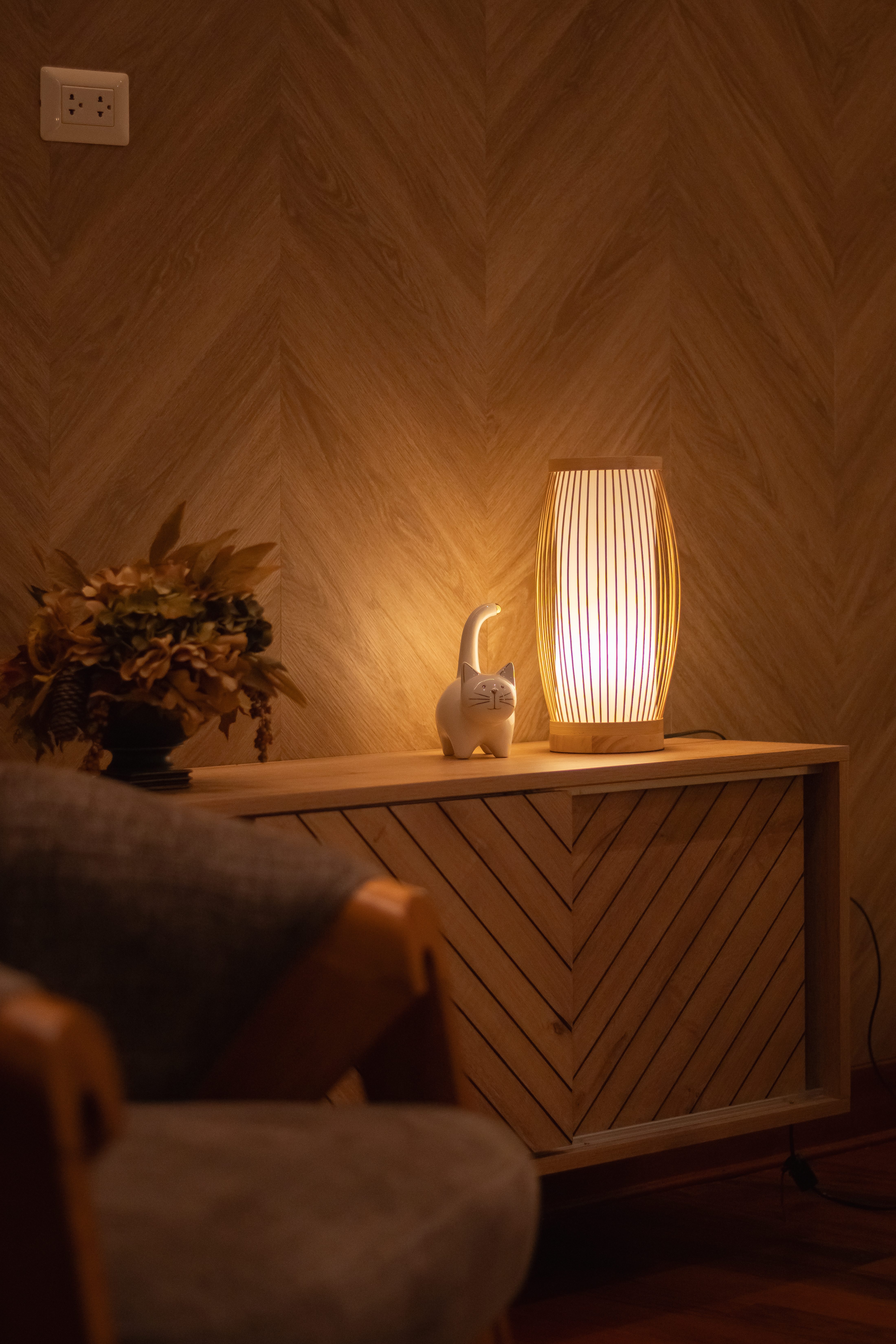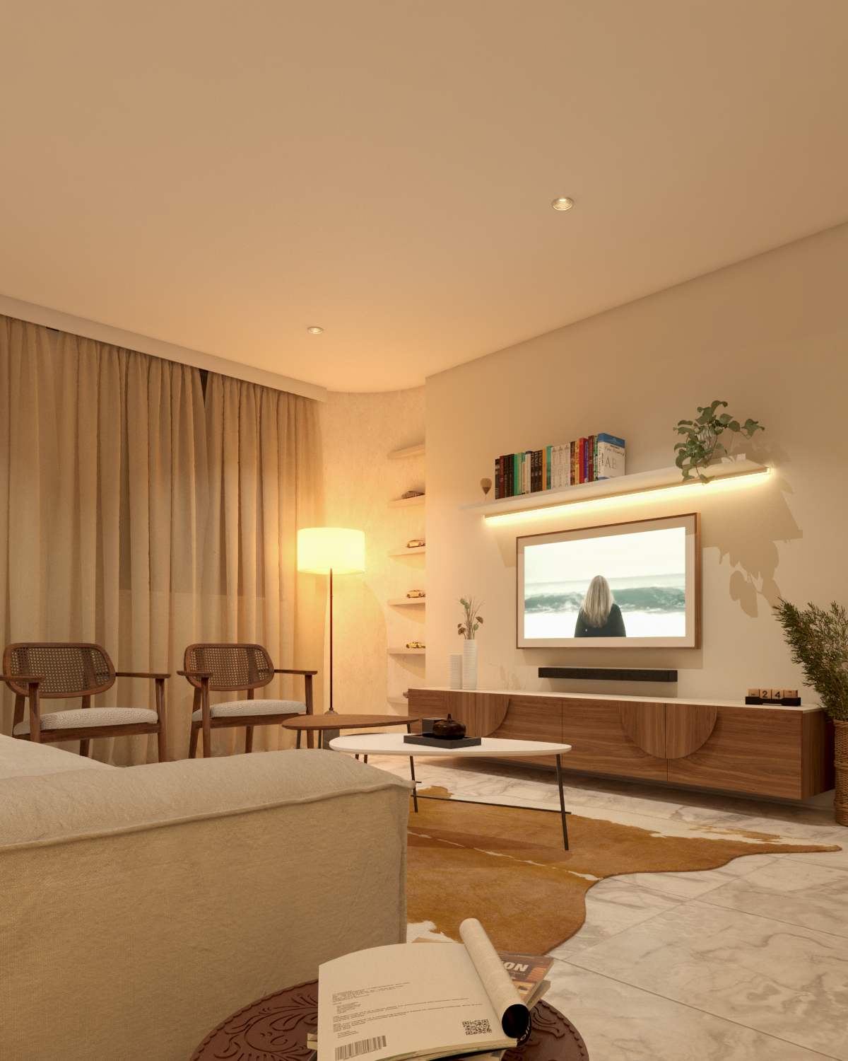 Diseño interior cálido y contemporáneo que integra sala, comedor y terraza; madera natural, tonos tierra y luminarias puntuales para una atmósfera acogedora.