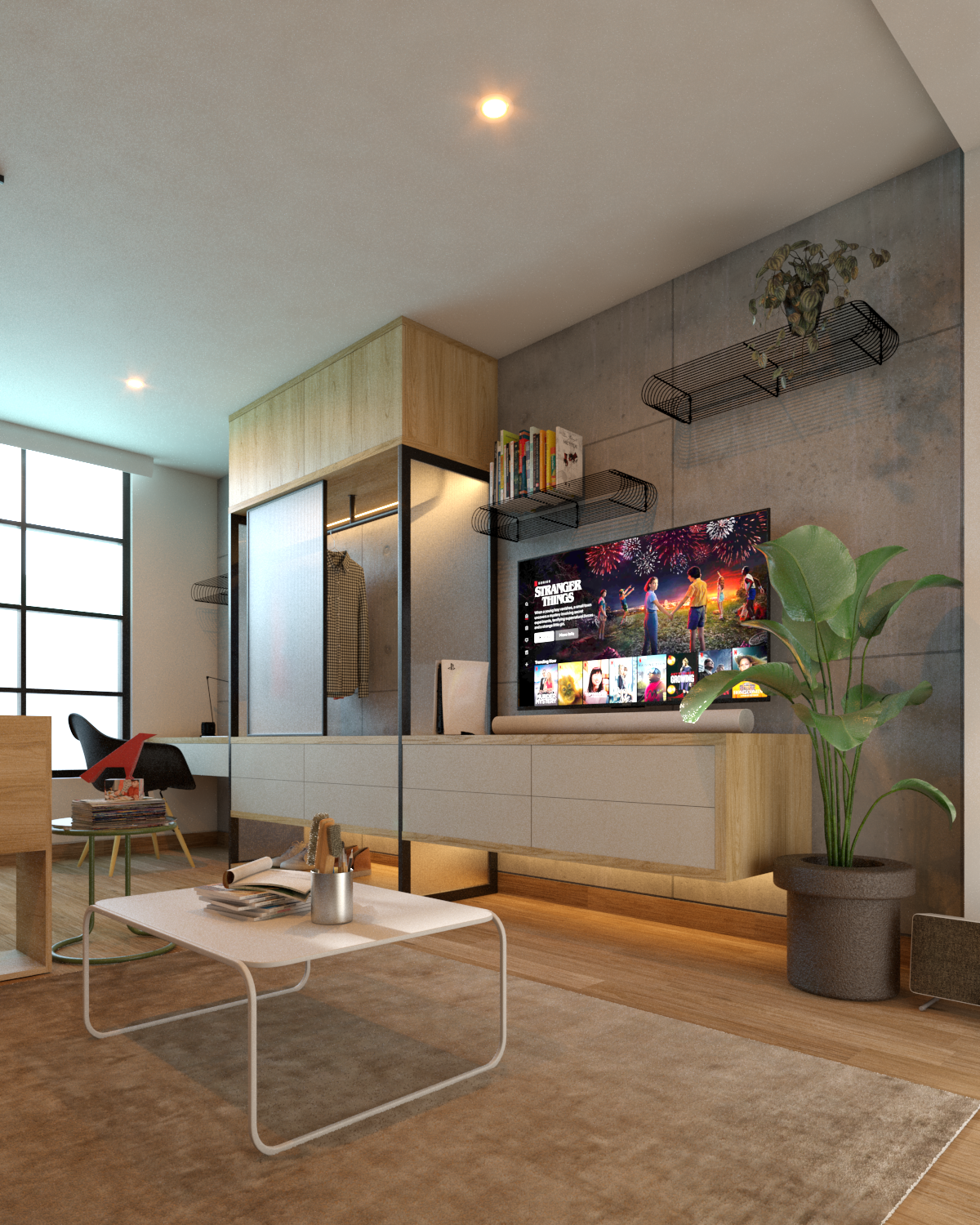 Diseño interior contemporáneo para departamento, maximizando espacios y creando ambientes funcionales con una estética moderna y acogedora.